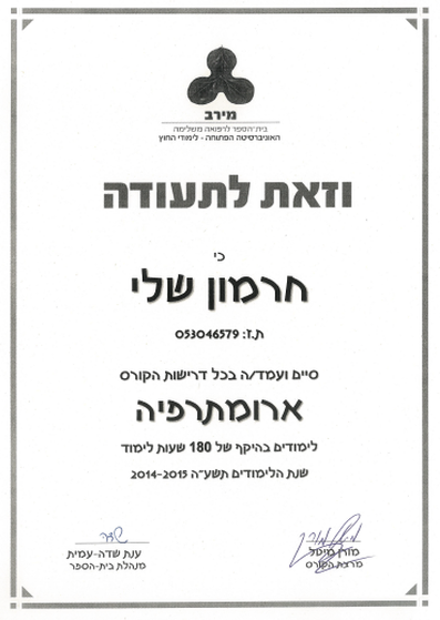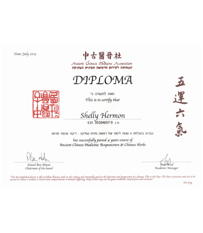 נעים להכיר, אני שלי חרמון, מטפלת מוסמכת .Dip. Ac ברפואה סינית עתיקה. בוגרת התוכנית ללימודי רפואה סינית עתיקה בפקולטה לחקלאות ברחובות, האוניברסיטה העברית. מטפלת בדיקור סיני ברחובות ובנס ציונה. מטפלת מוסמכת גם בארומתרפיה ופרחי באך.